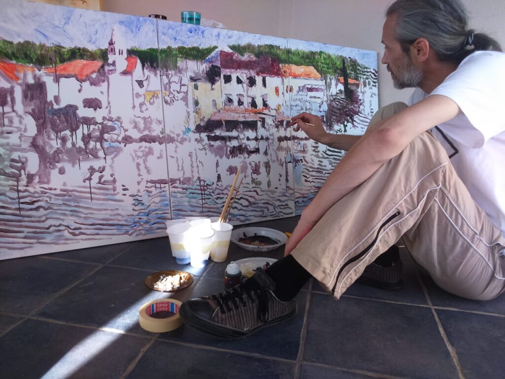 For me, Zlarin always offers a specific rhythm of work. The island, the sea and the simplicity of everyday life naturally slow down the process and allow for focus and attentive making. This environment encourages reflection, conversation and a return to the essentials of painting.